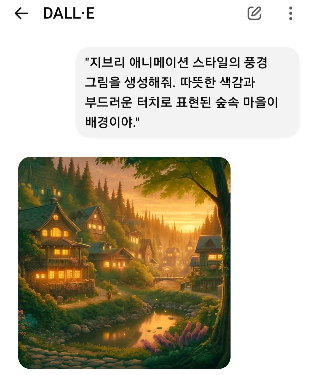 - "지브리 애니메이션 스타일의 풍경 그림을 생성해 줘. 따뜻한 색감과 부드러운 터치로 표현된 숲 속 마을이 배경이야."
